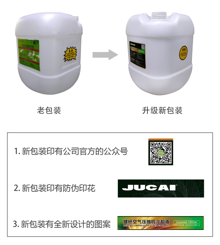 此冷卻液是專為JUCAI螺桿空氣壓縮機研制的合成潤滑油,油品性能及其穩(wěn)定。因品牌持續(xù)強大,產(chǎn)品持續(xù)火紅,調(diào)查發(fā)現(xiàn)有不法分子仿冒JUCAI品牌產(chǎn)品螺桿空氣壓縮機冷卻液,為保障消費權益,樹立更好的品牌形象,公司絕對嚴厲打擊仿冒。公司在經(jīng)過交流溝通后,特將包裝做統(tǒng)一調(diào)整,并從2019年1月份新包裝開始陸續(xù)推出,屆時請各位顧客留意并及時關注。具體包裝形象更改如下: